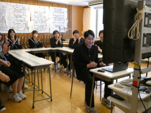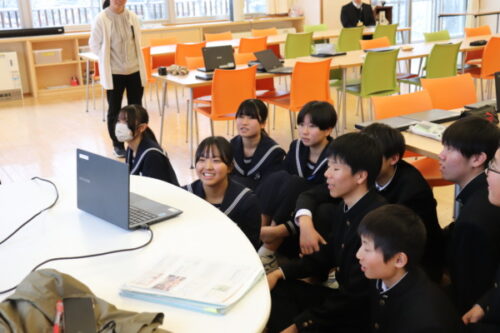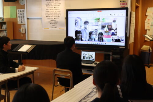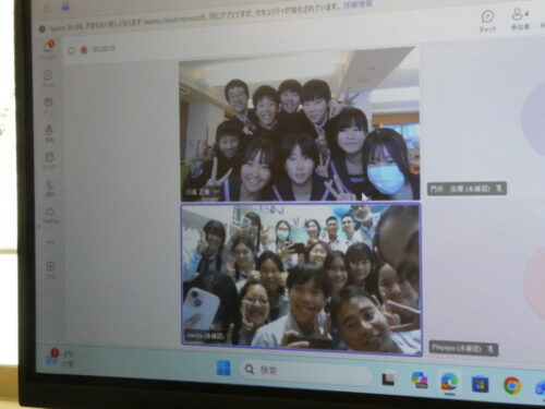 1/20 「難しさ」も「楽しさ」も(2,3年生 タイ交流) 2026年1月21日 に 平中学校 が投稿 タイの中学生との3回目のオンライン交流に、2,3年生が臨みました。 簡単な自己紹介。 かなづかいや発音から、一緒にあいさつを練習。 お互いに気になる食文化。 伝わると歓声が沸き上がりました。 伝えることの「難しさ」も「楽しさ」も実感することができました。